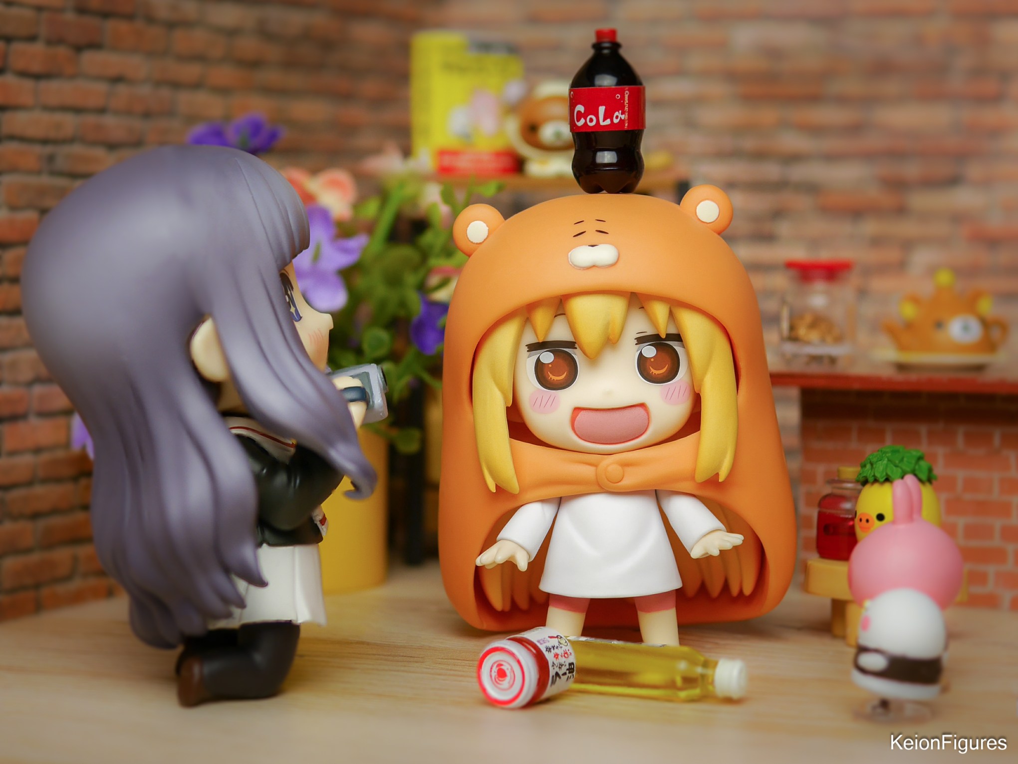In einer Ecke des Cafés stand Umaru. Sie hatte vor kurzem einen Skill erlangt: Sie konnte Gegenstände auf ihrem Kopf balancieren! 🤹♀️ Vor ihr lagen aber bereits eine Flasche und ein Konfitürenglas, das leider zu Boden gefallen war. Aber Umaru ließ sich davon nicht entmutigen. Sie nahm diesmal eine Cola-Flasche, setzte sie vorsichtig auf ihren Kopf und begann, sie zu balancieren. Die Gäste im Café staunten und klatschten Beifall. 👏😮