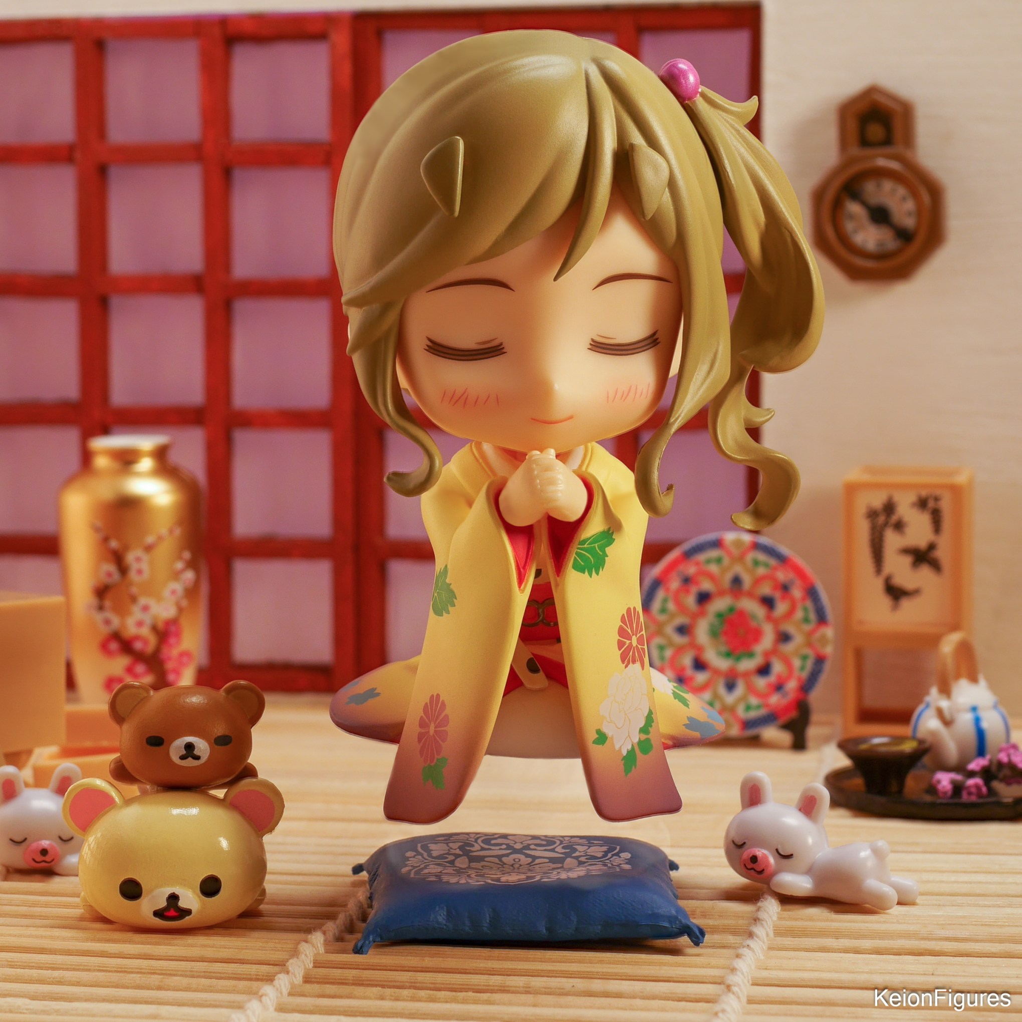 Nach einer Weile landet Aoi wieder sanft auf ihrem Kissen. Sie öffnet die Augen und lächelt. Die Rilakkumas und Hasen scheinen von ihrer Ruhe und Gelassenheit angesteckt zu sein. Gemeinsam genießen sie den friedlichen Moment in diesem besonderen Ryokan. Die Sonne geht langsam unter, und der Raum wird von einem warmen, goldenen Licht erfüllt. 🌞🌅