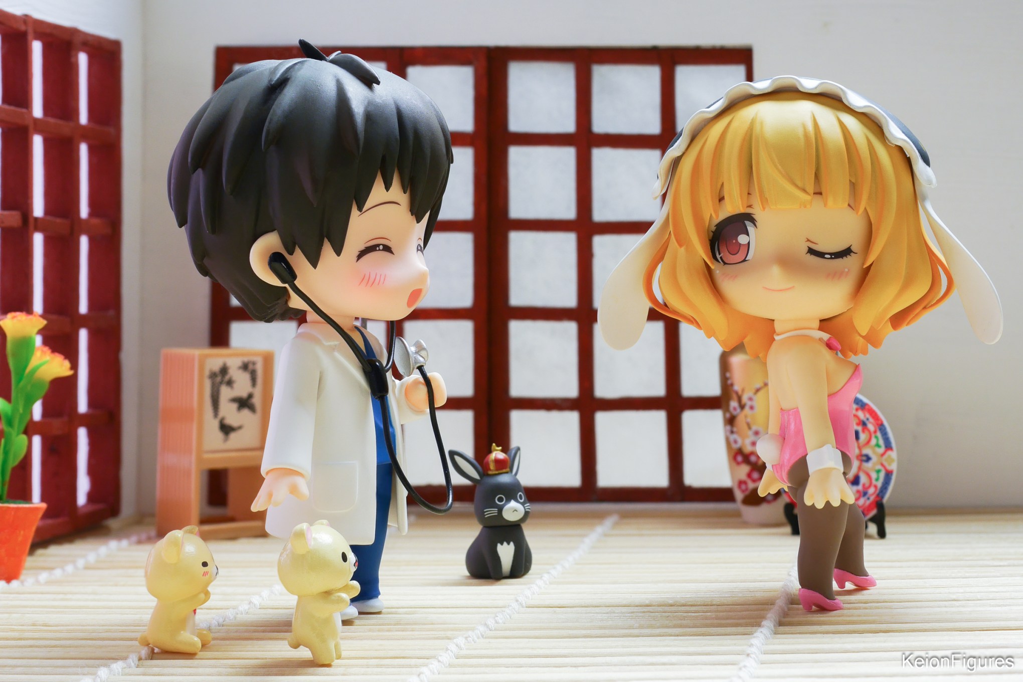 In a Ryokan, Sharo, dressed in a cute bunny costume, reassures Taki that his heartbeat sounds strong and healthy. Taki, clad in a doctor’s coat and using a stethoscope, blushes slightly as Sharo winks at him, expressing gratitude for her presence, which makes him feel much better. 💓😊