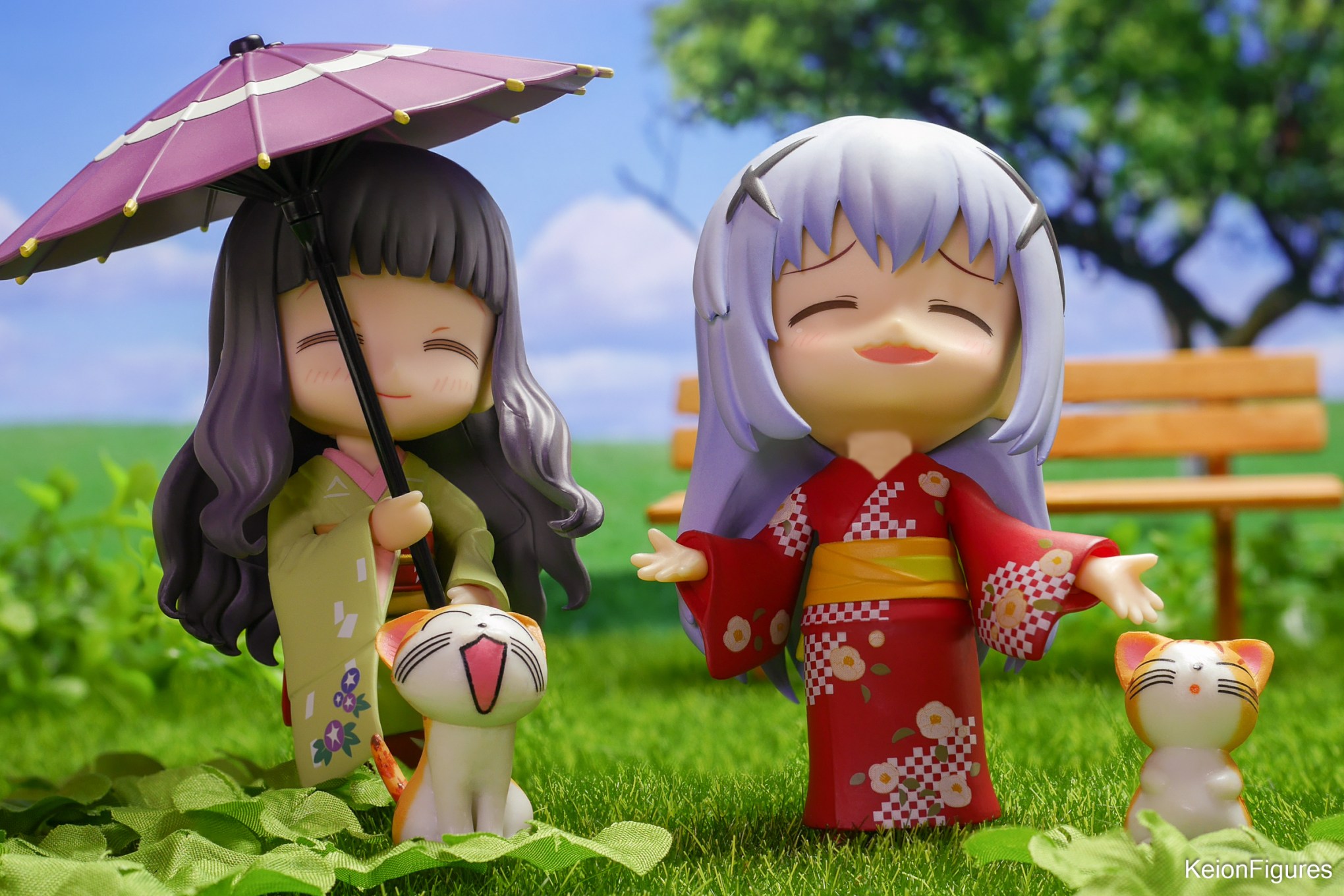 Chino and Tomoyo, clad in colorful kimonos, stand in a blooming meadow, savoring the warmth of the sun on their skin. ☀️🌼 Tomoyo holds a parasol, providing shade as they both enjoy the natural surroundings. „Yes, it’s truly a perfect day,“ Tomoyo agrees. 🌸☂️
