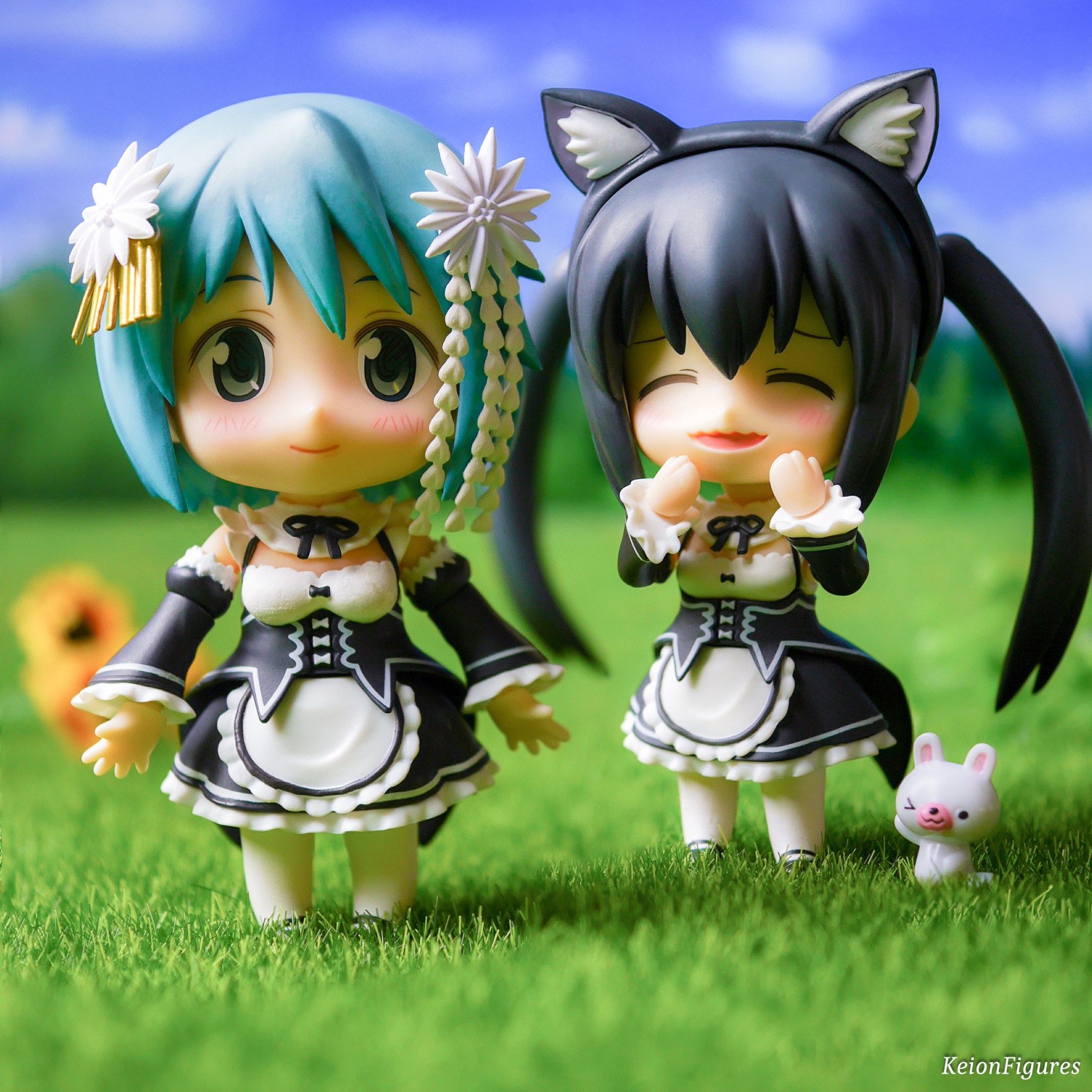 Sayaka and Azusa, dressed in maid costumes with Azusa also wearing cat ears, enjoy a sunny day on a green meadow. They dream of opening their own café named „Café Sonnenschein,“ where visitors can wear costumes and enjoy homemade treats. The story captures their joy and excitement, symbolized by their playful attire and the happy little rabbit beside them. 🌞🍰🐇