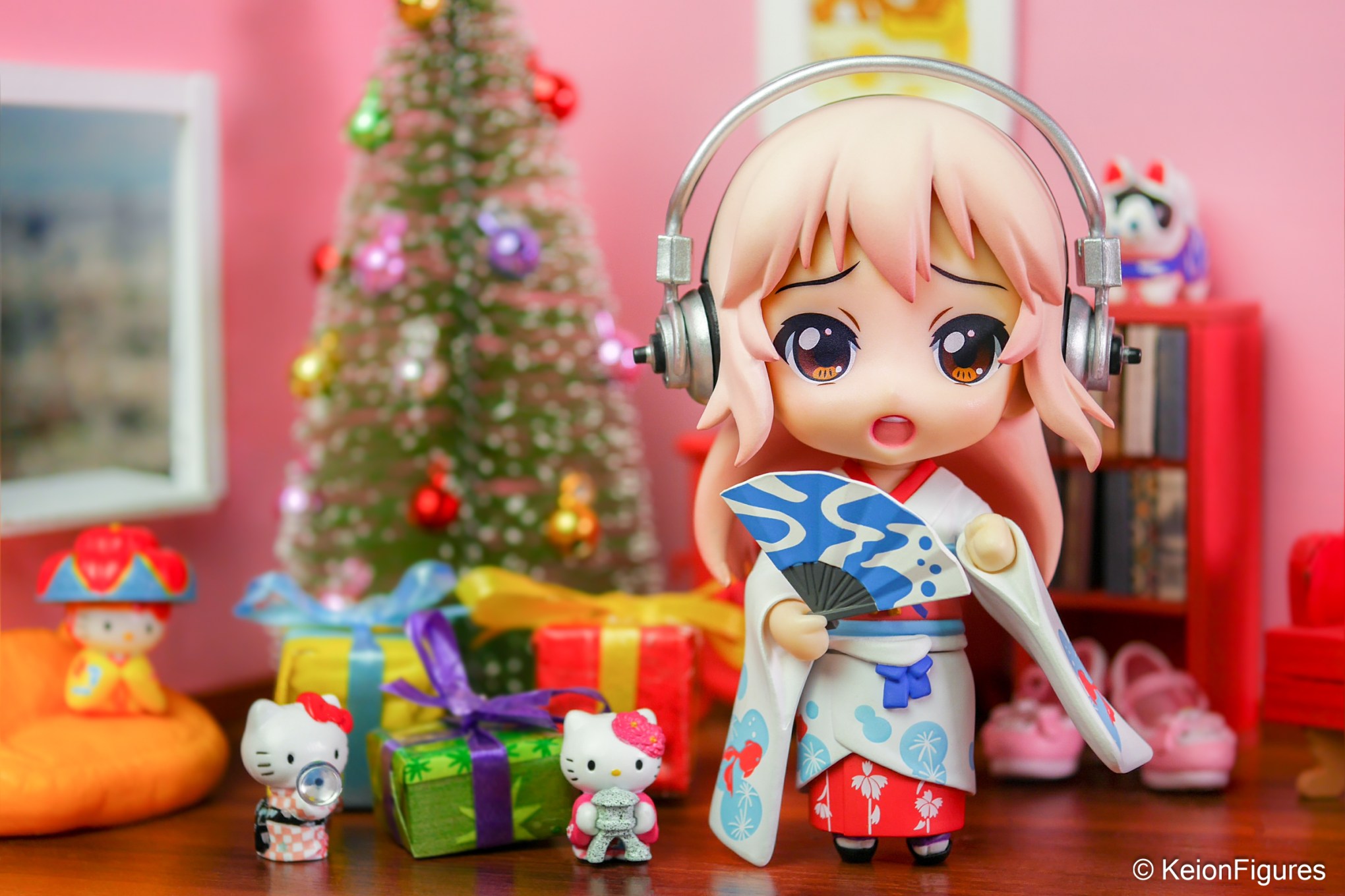 It was Christmas Eve, and Super Sonico had decorated her home with twinkling lights and colorful ornaments. The Christmas tree stood proudly in the corner, surrounded by neatly wrapped presents. Wearing her traditional kimono and her signature headphones, Sonico hummed along to cheerful holiday tunes. The atmosphere was warm and cozy, with little „Hello Kitty“ figures adding a playful touch to the scene. Everything was ready for a night filled with joy and laughter. 🎄🎶🎁