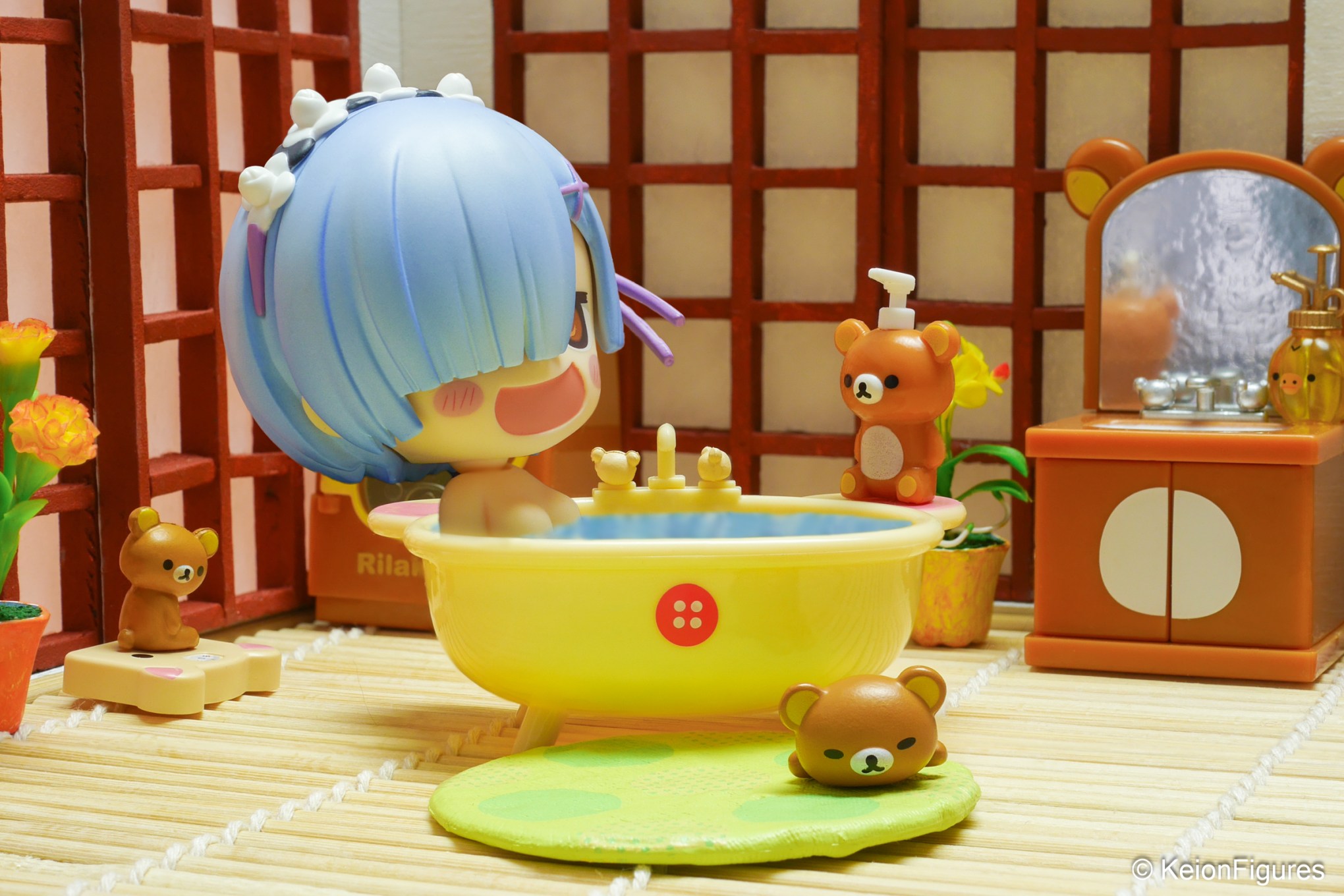 Surrounded by adorable Rilakkuma figures, Rem couldn’t help but giggle. One sat on the edge of the tub, balancing a soap dispenser, while another relaxed on a tiny bath mat. The whimsical decor lifted her spirits, and for a moment, she imagined the little bears coming to life and sharing a laugh with her. Their presence made her bath feel magical. 🛁🐻