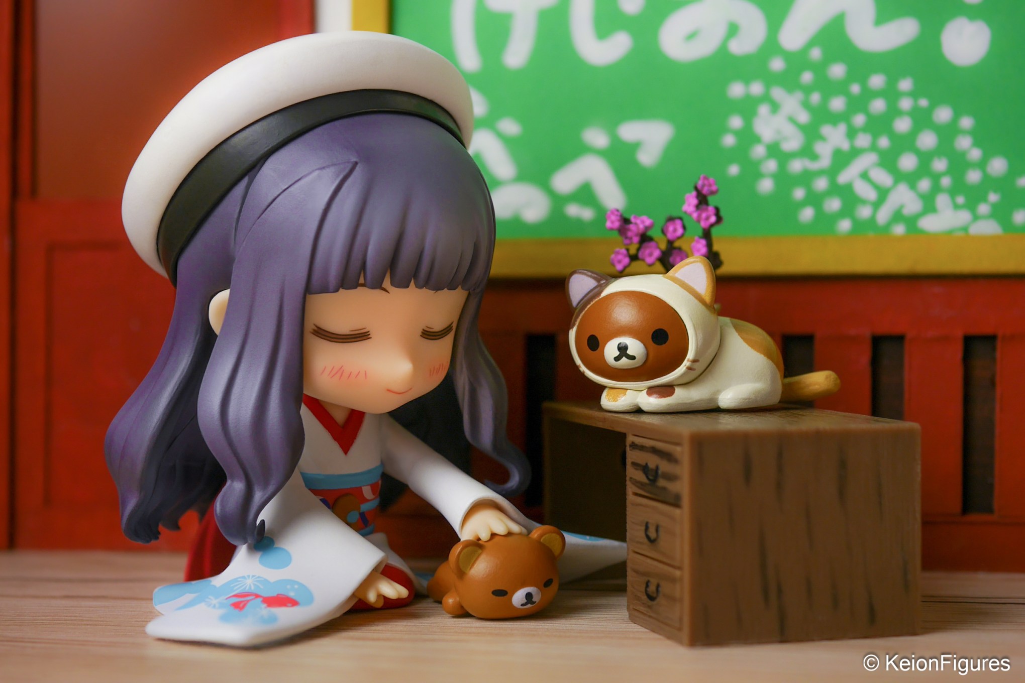 Tomoyo cherished her peaceful moments in the K-On clubroom. Wrapped in her elegant kimono, she sat on the wooden floor, gently stroking Rilakkuma’s soft head. The little bear seemed to melt under her touch, while Chairoikoguma, dressed as a cat, lounged lazily on the table nearby. The warm sunlight streaming through the windows painted the room in a golden glow, and the faint sound of birdsong outside added to the tranquility. 🌞🐻🌸
