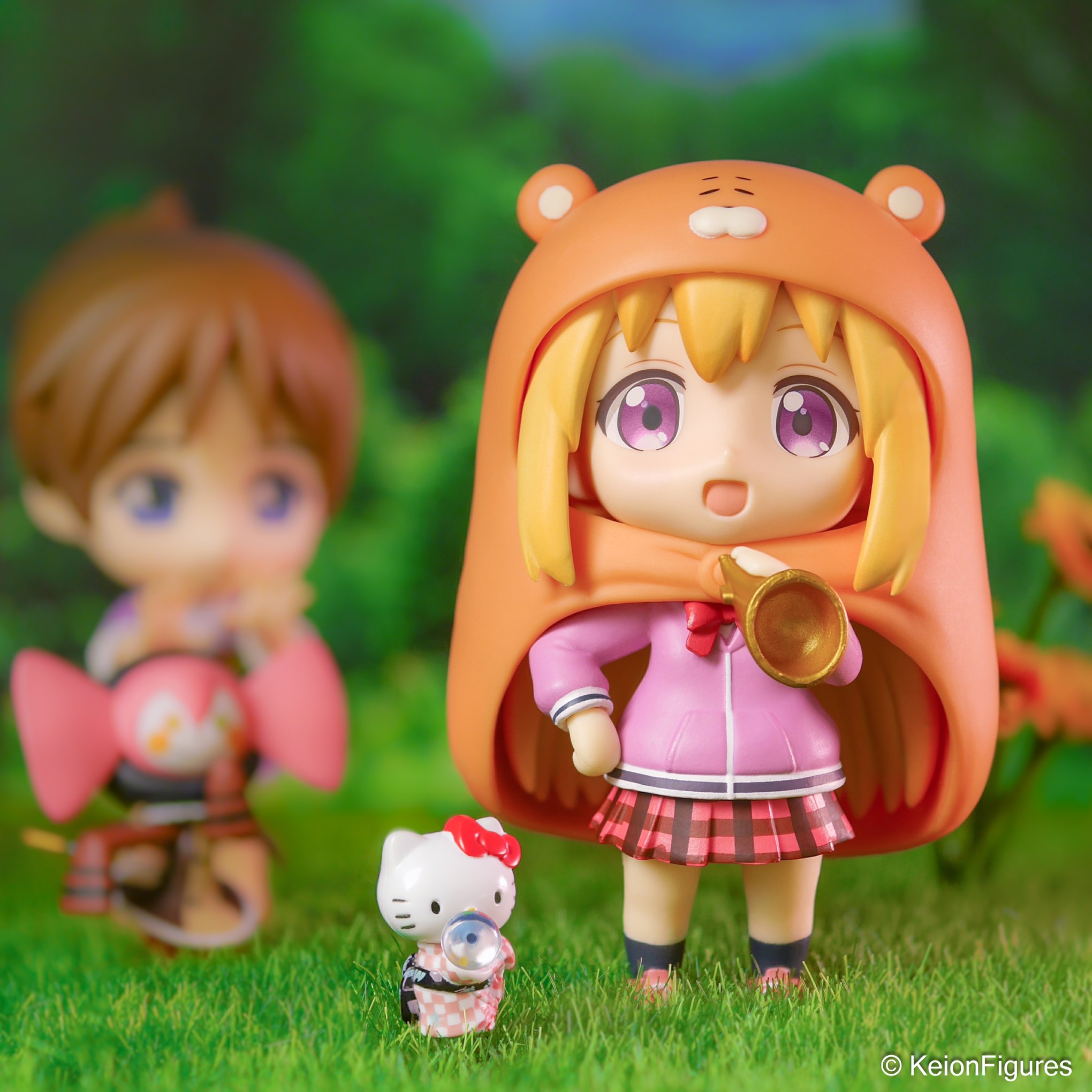 Nearby, Ui sat under a tall sakura tree, carefully arranging a picnic with neatly packed onigiri and a thermos of green tea. Watching Umaru’s playful performance, she giggled softly. By her side stood a tiny Hello Kitty figure, holding a crystal ball, as if predicting how the day would unfold. In the distance, Charlotte fiddled with her camera, trying to capture the perfect shot of the lively scene. 🍱📷🍵