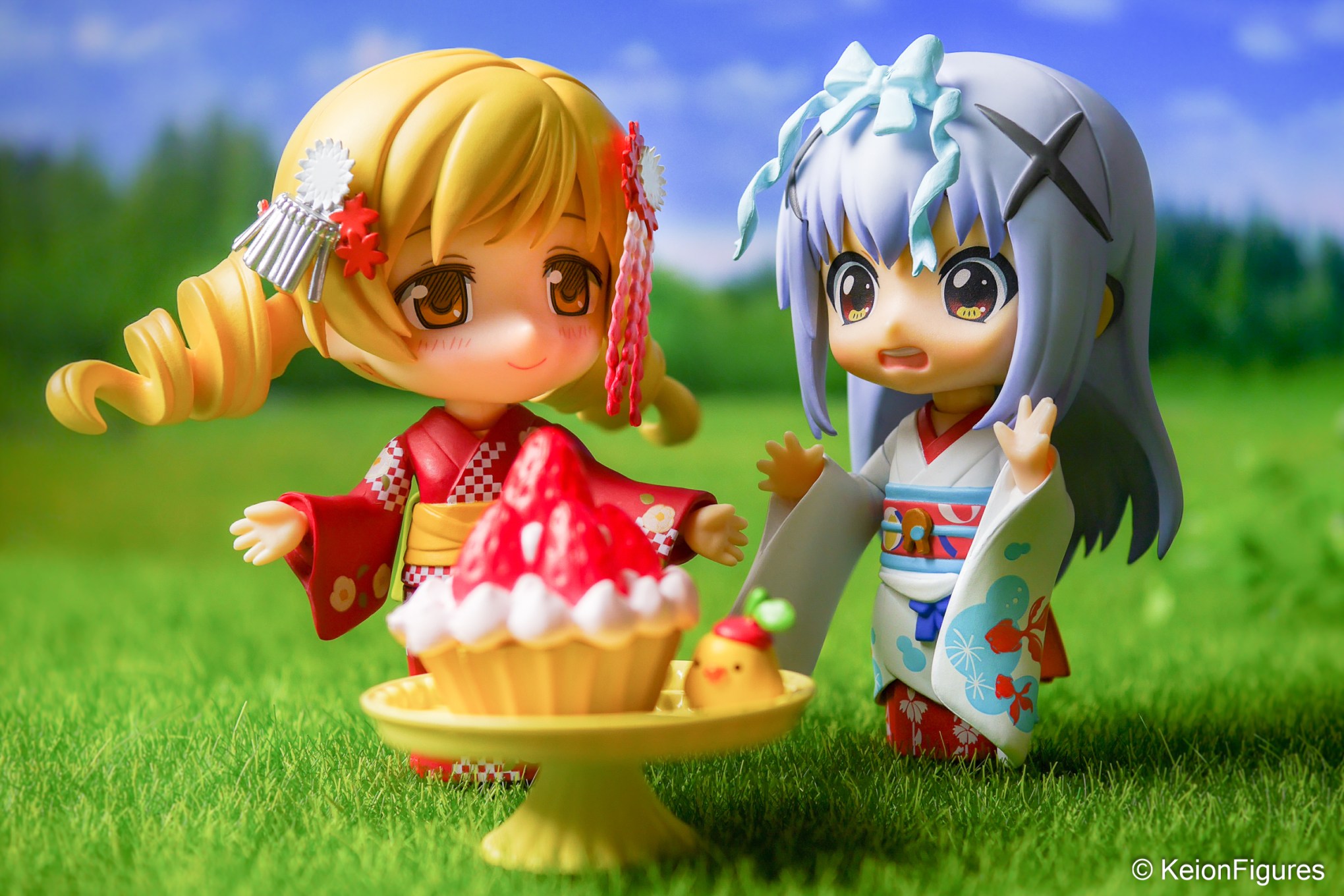 They settled under a tall sakura tree, even though the cherry blossoms had long faded. On a small tray, they placed a freshly made strawberry tart, topped with whipped cream and decorated with a tiny pudding chick. “This looks like something from a Kyoto sweets shop,” Chino said in awe. 🍓🍮🌳