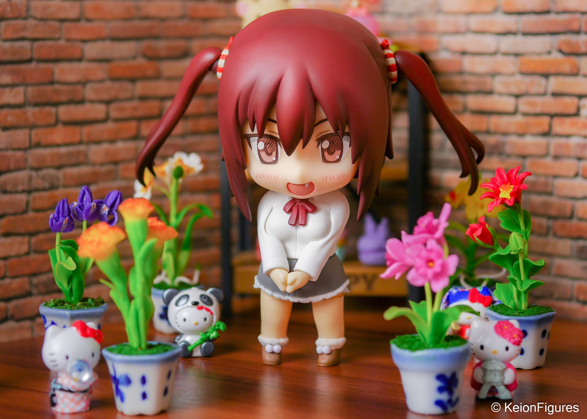 Nana found a seat by the window, where miniature flower pots lined the wooden ledge. Each one held delicate blooms—irises, lilies, and camellias, all crafted with care. Among them, she spotted a small Hello Kitty in a panda costume and giggled softly. The playful mix of kawaii and elegance made her feel right at home. 🐼🌼💕