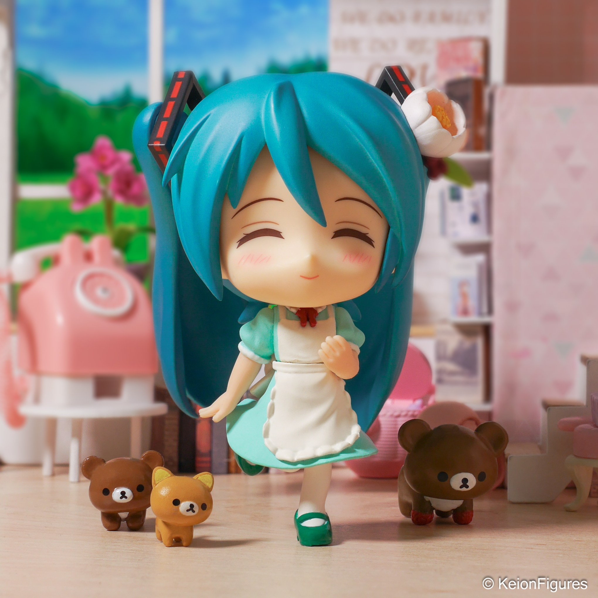 An diesem besonderen Tag hatte Hatsune ihre kleine Schürze angezogen – sie wollte für ihre Bärenfreunde ein süßes Festmahl zaubern. Mit einem fröhlichen Lied auf den Lippen tanzte sie durch das Zimmer. Ihre Begleiter, die drei Kawaii-Bären – Rilakkuma, Korilakkuma und Chairoikoguma – trotteten verspielt hinter ihr her. Ihre Küche, ausgestattet mit einem rosa Retro-Telefon und einem Regal voller Manga-Bände, war der Mittelpunkt ihres kleinen Glücks. 🎶🐻📚