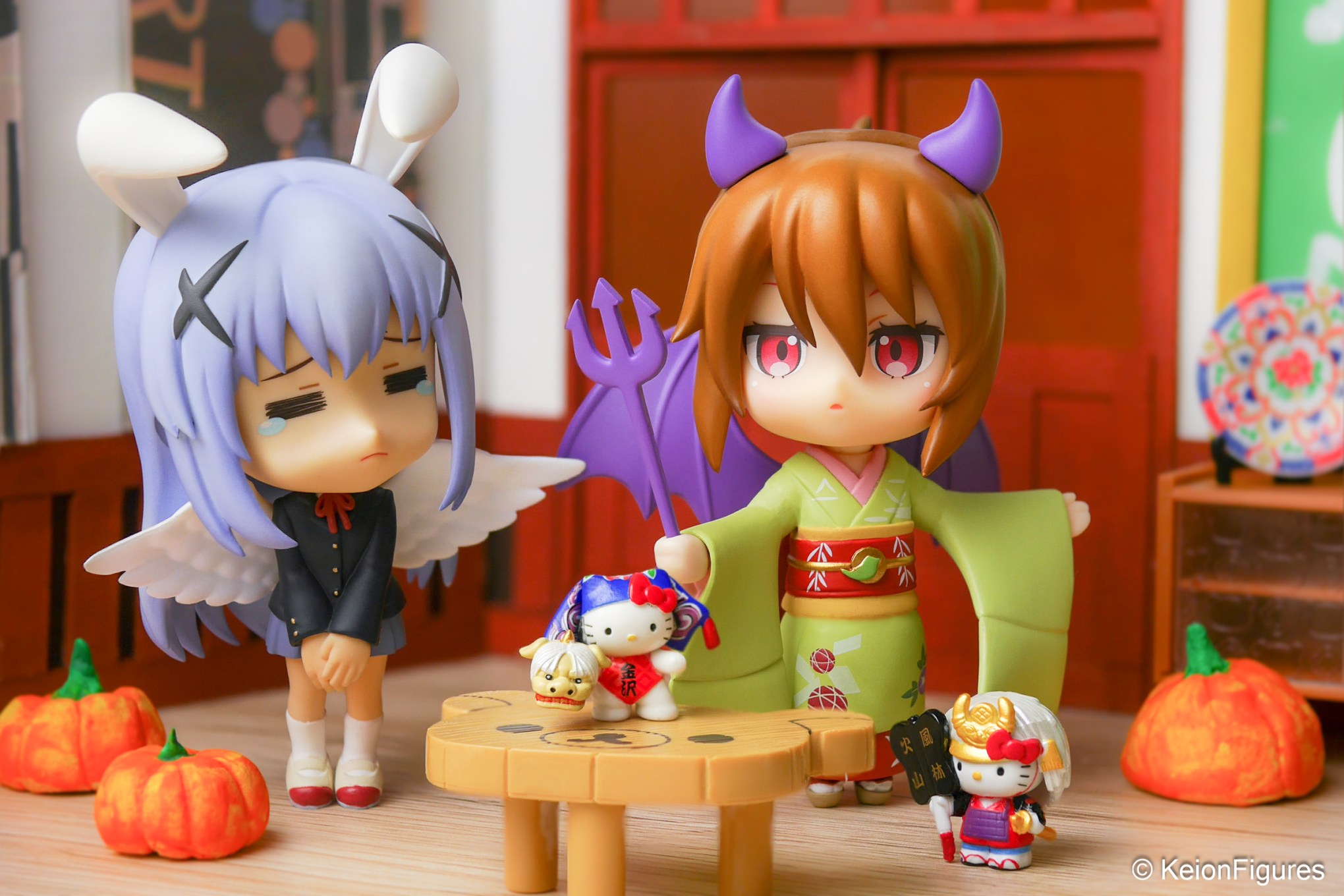 Auf dem niedrigen Chabudai-Tisch hatten sie mehrere kleine Figuren aufgestellt: Hello Kitty in Samurai-Rüstung und Festtagskleidung. Für Tsumugi war es wichtig, einen Hauch von japanischer Kultur einzubringen – zwischen Kürbissen und Wagashi, die sie liebevoll vorbereitet hatte. Chino betrachtete die Figuren und spürte, wie ihre Unsicherheit langsam schwand. 🪭🍡