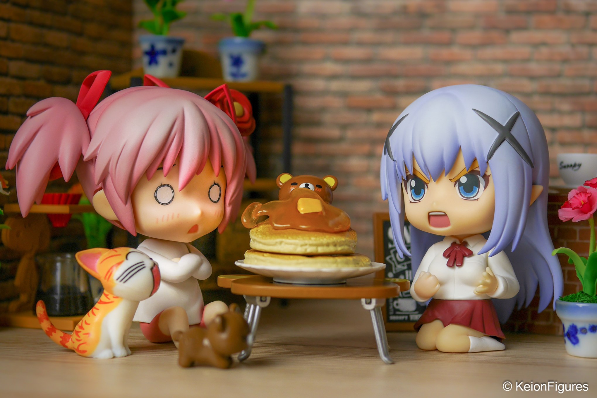 In a cozy café tucked between the narrow streets of Kyoto, Madoka and Chino sat across from each other, sunlight streaming through the shōji screens. The aroma of matcha and warm pancakes filled the air, mingling with the distant sound of a shamisen from a nearby teahouse. It was a perfect afternoon to relax and enjoy a sweet treat together. 🍵🌸