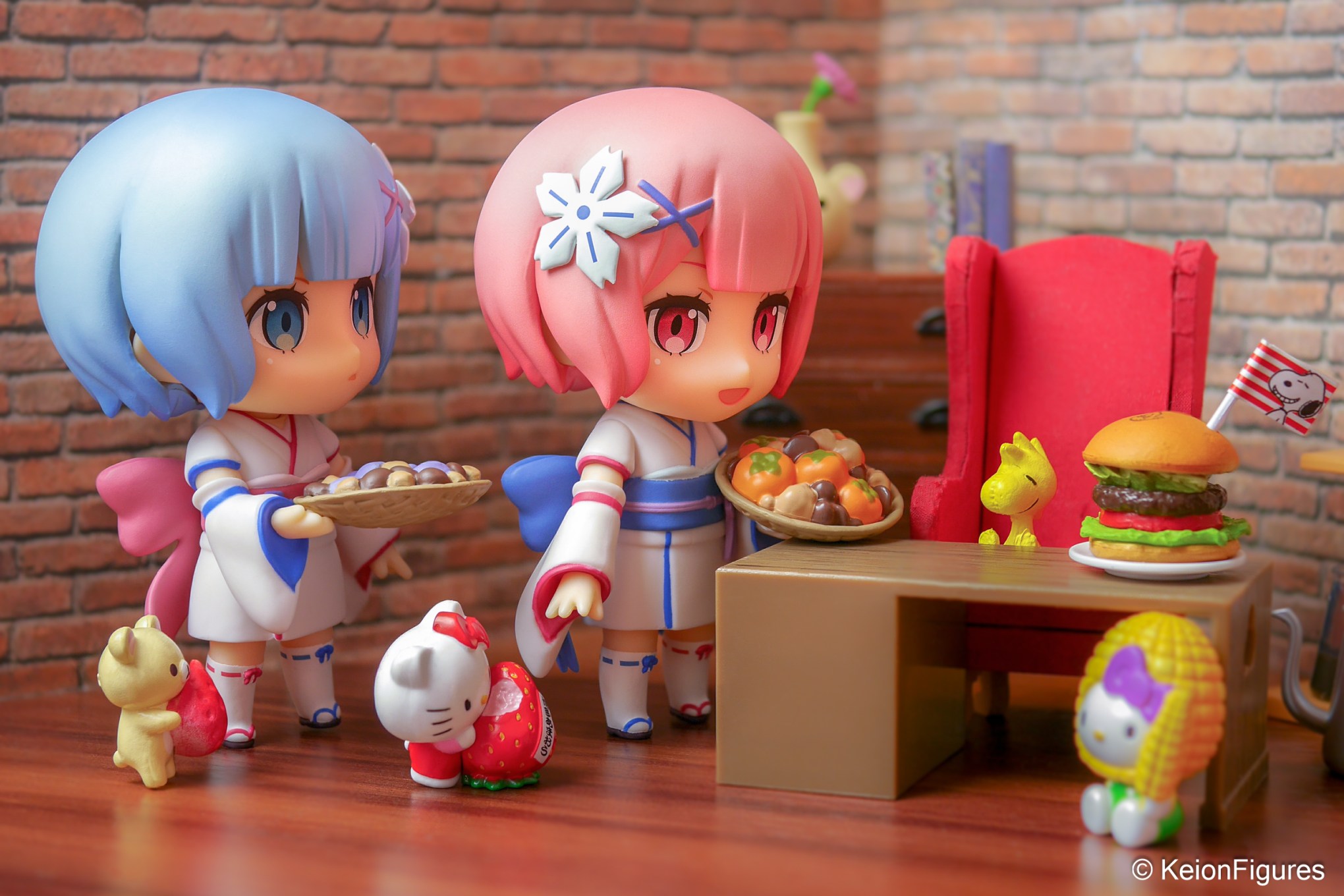 An einem niedrigen Holztisch hatten es sich die Gäste gemütlich gemacht. Hello Kitty saß ordentlich auf ihrem Stuhl und faltete erwartungsvoll die Hände. Korilakkuma lehnte entspannt zurück und betrachtete die Kuchenvitrine. Woodstock hüpfte aufgeregt hin und her, denn der frisch zubereitete Burger war eindeutig für ihn bestimmt. Als Ram ihn servierte, funkelten seine Augen vor Freude. 🍔🐥✨