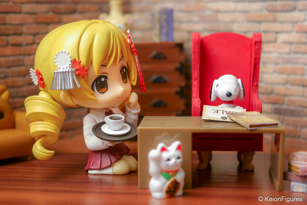 Am Tisch saß Snoopy, entspannt in einem roten Sessel, vertieft in eine Zeitung, die von Reisen nach Kyoto berichtete. Neben ihm winkte eine Maneki-neko, deren erhobene Pfote leise im Takt der Zeit schwang. Mami stellte die Tasse behutsam ab, verbeugte sich leicht und lächelte. In diesem Moment schien selbst das leise Läuten eines Fūrin-Windglöckchens den Frieden zu unterstreichen. 🐶📖🎐